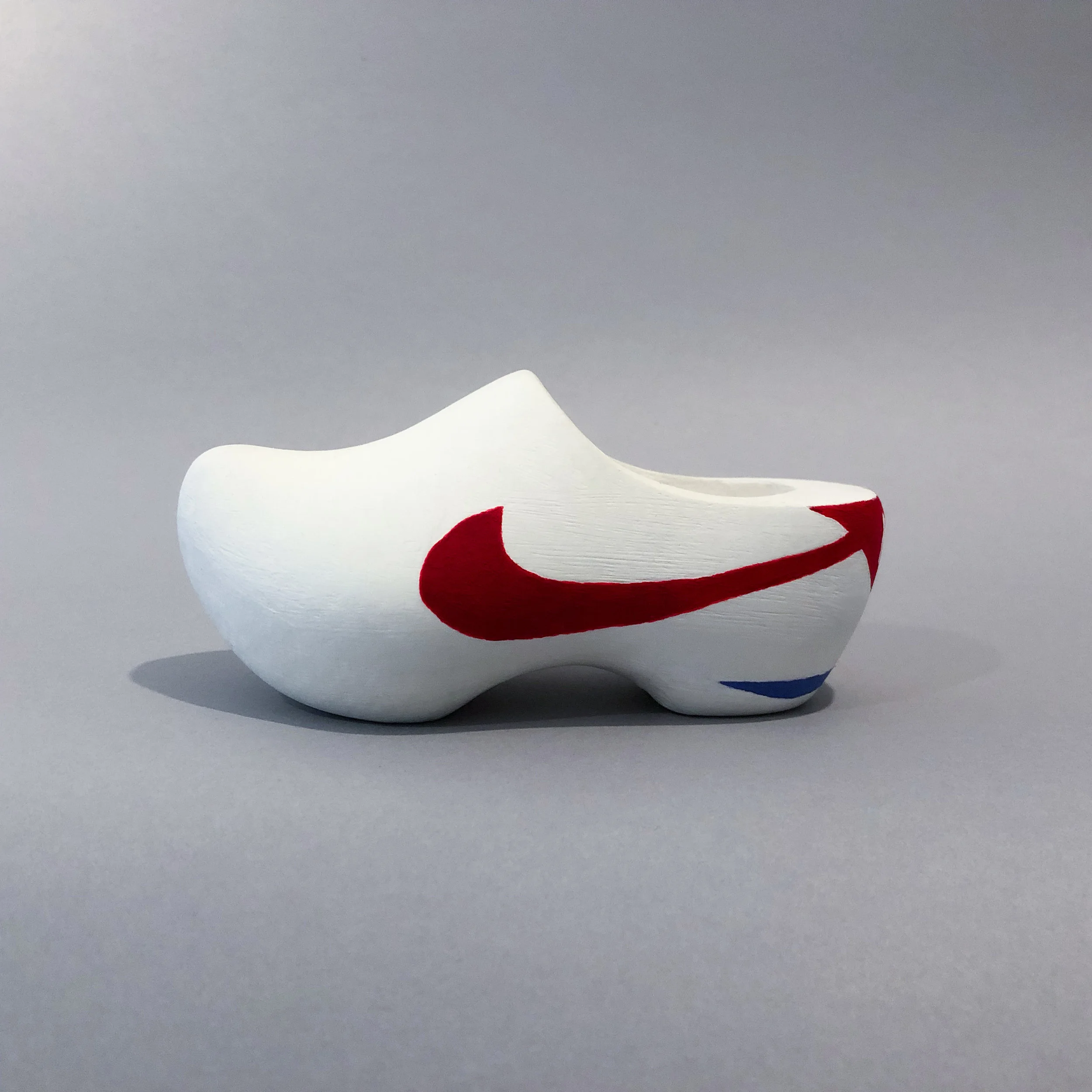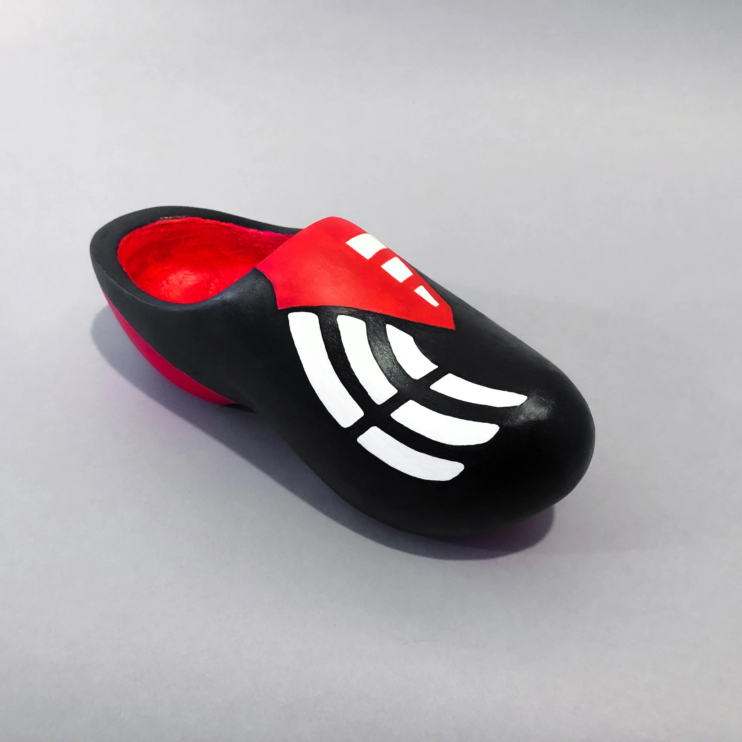 Traditional Dutch wooden klompen (clogs) made contemporary; hand-painted as iconic sneakers and football boots.